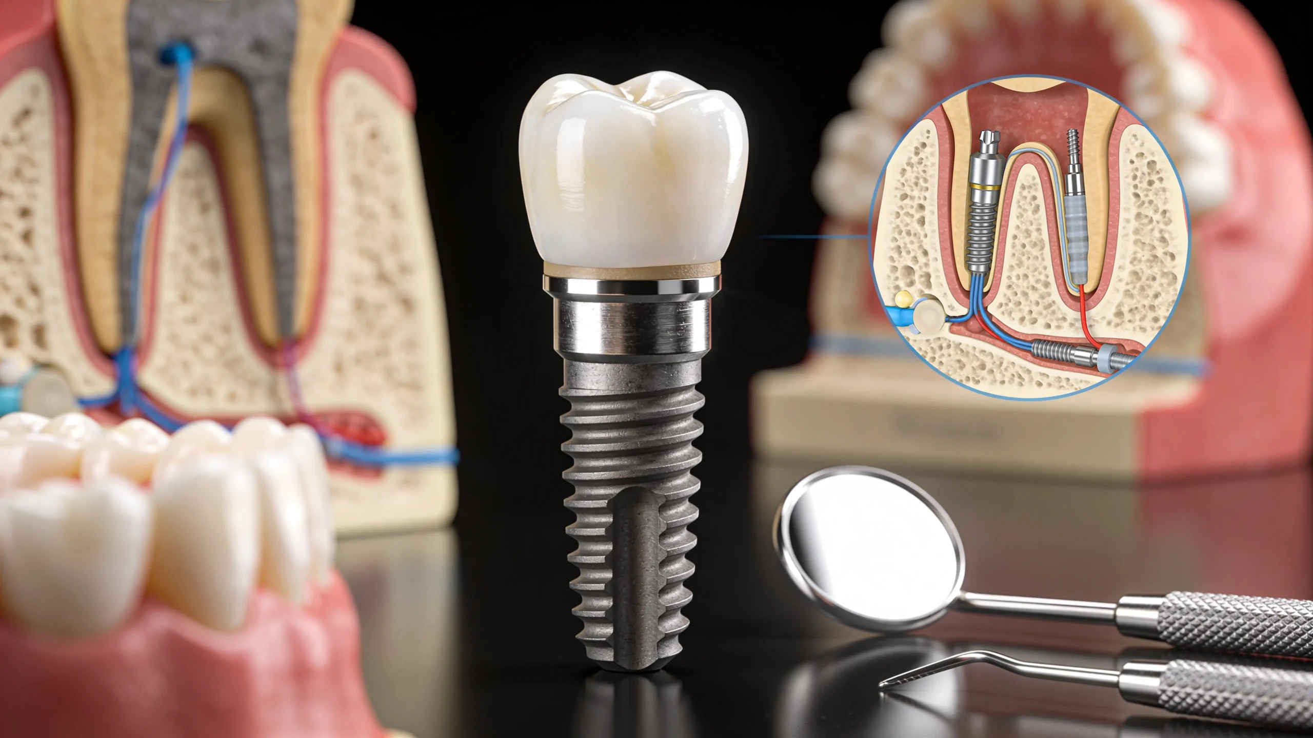- Implantatkörper: Die meist aus Titan gefertigte Schraube, die chirurgisch in den Kieferknochen eingebracht wird